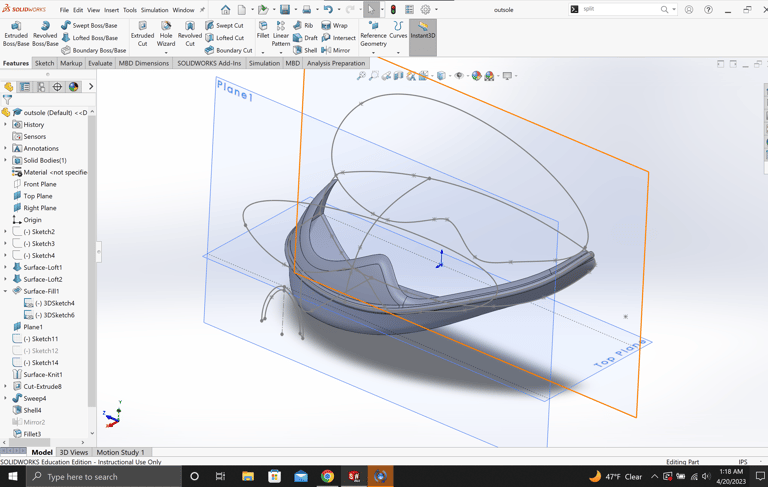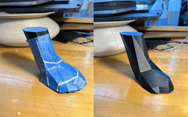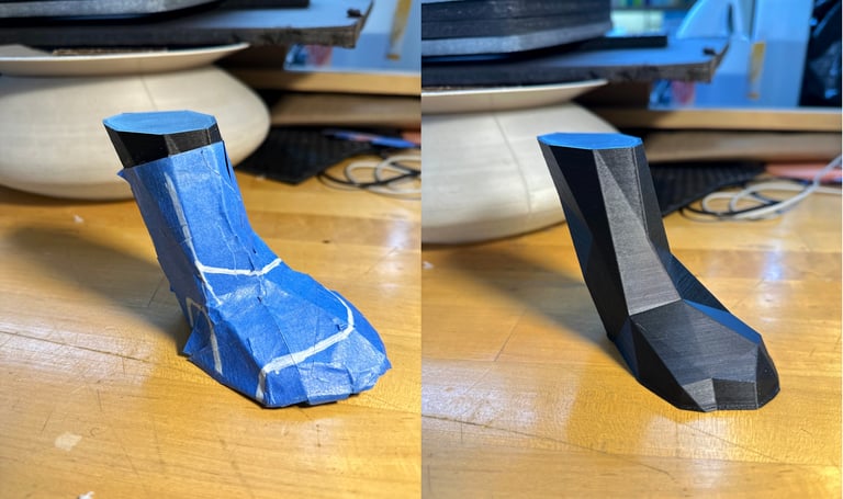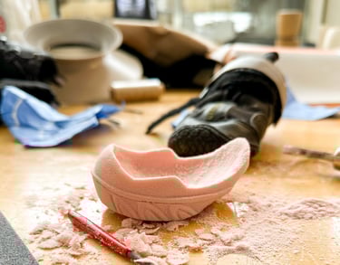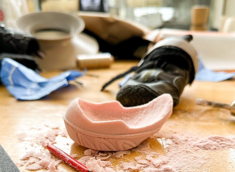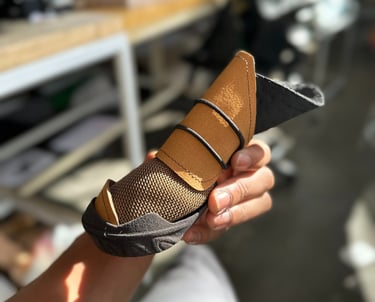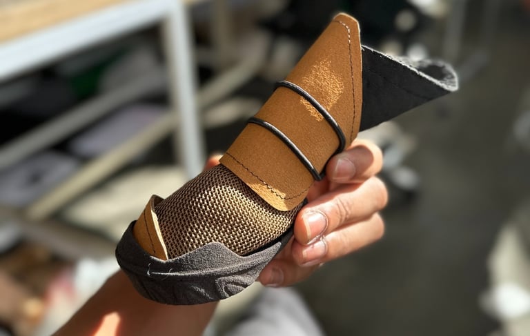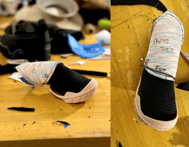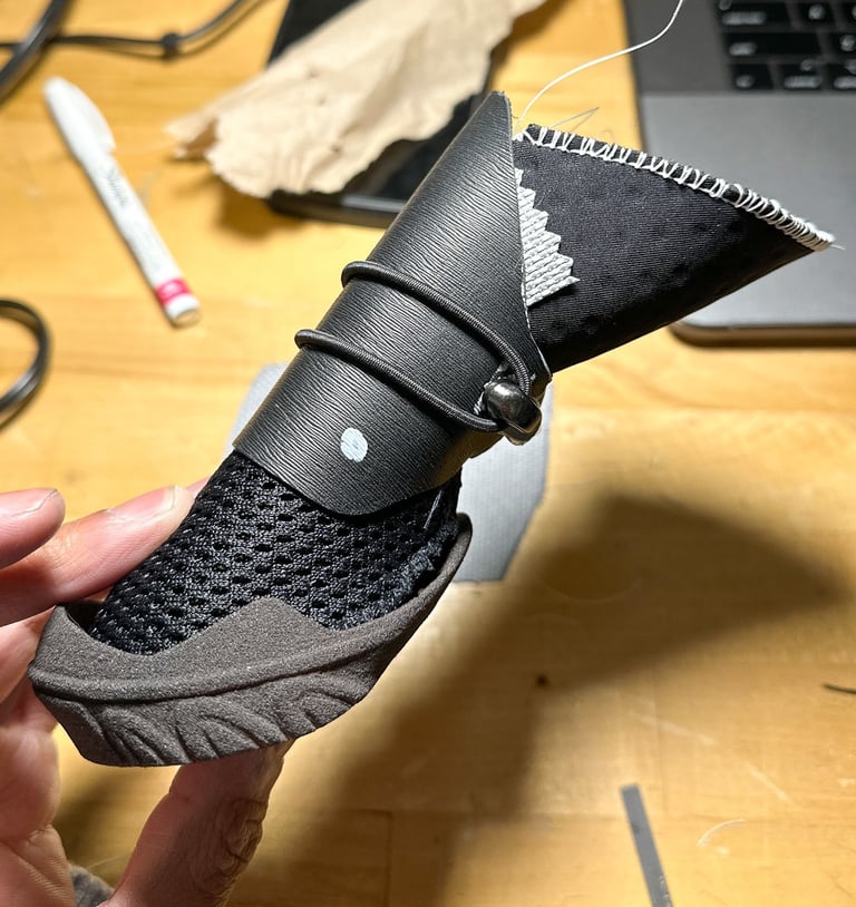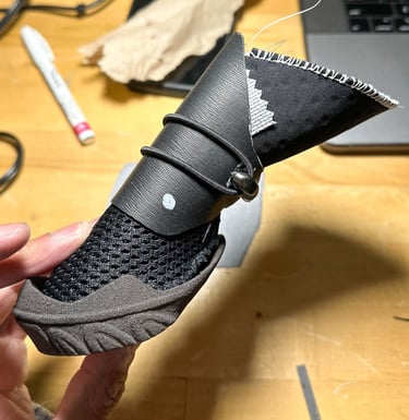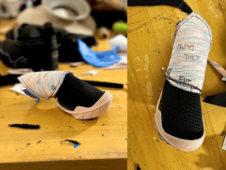 Developing the 1:1 scale model was a rewarding stage. To better articulate the organic form, I started by sculpting the outsole with modeling foam, then created a 3D print and finished it by hand. The leather and nylon upper was meticulously cut and stitched by hand. I take great pride in the craftsmanship of producing functional and aesthetic prototypes, as this process offers valuable insights into the design itself.