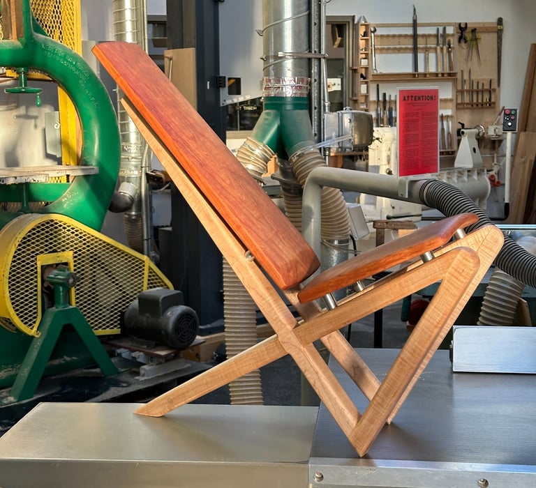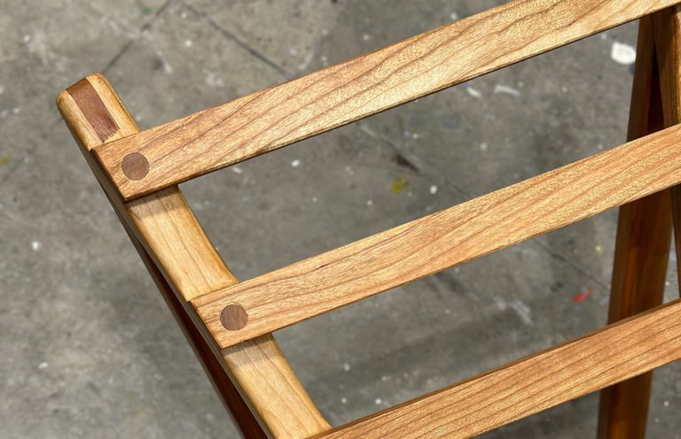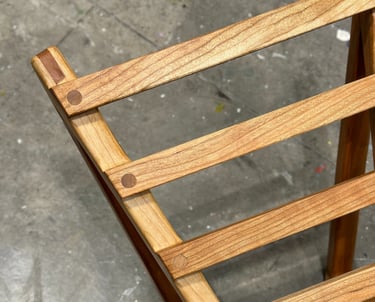 Handmade slated seat comprised entirely of American cherry wood using half laps, bridle, and dowel joinery.