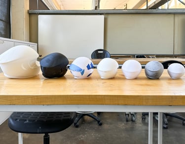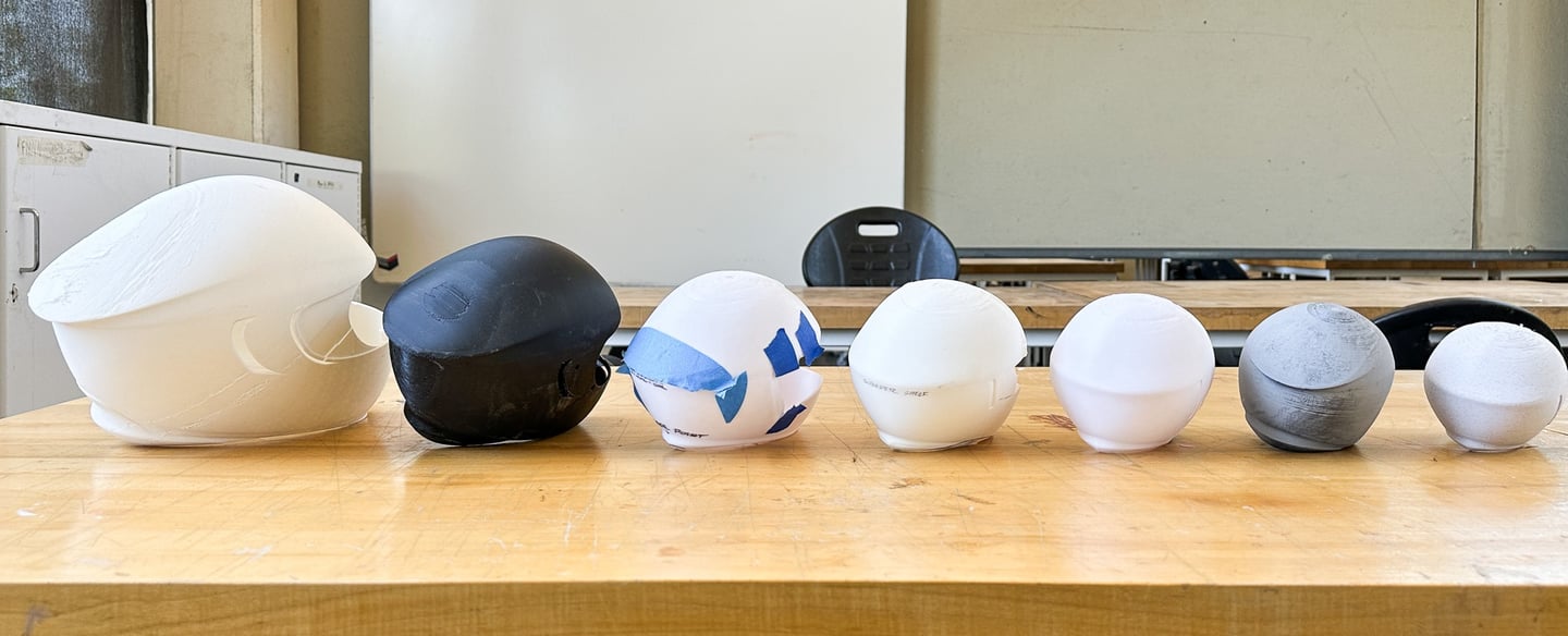 The final prototype comprises six 3D-printed sections bonded together, featuring a custom wiring harness for all the electronics. It includes two ultrasonic sensors, one microcontroller, six LED indicators, one temperature and humidity sensor, one microblower, and one servo motor.