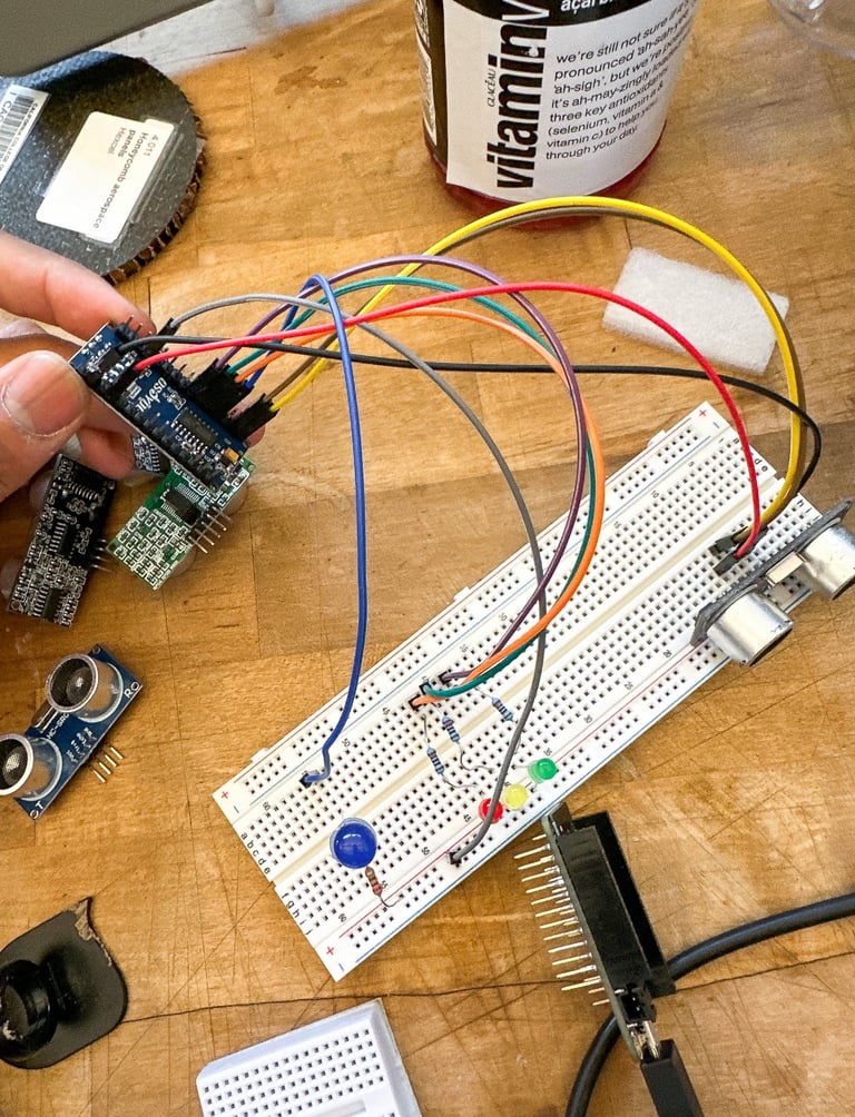 Rear-facing ultrasonic sensors detect nearby vehicles and send data to the Arduino alerting the rider of blind spot threats using purposefully blue-colored LEDs placed in the rider's peripherals.